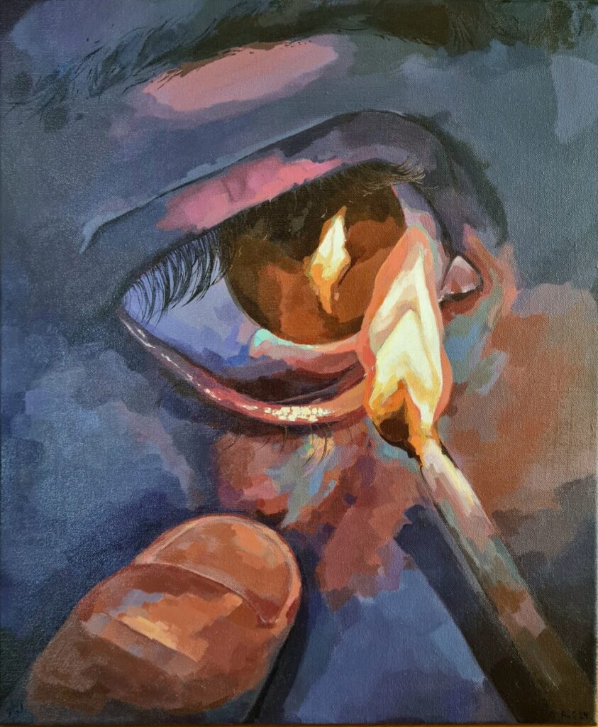 När jag höll tändstickan framför ögat och bad min bror fota, fick jag en stark inre bild av vad paranoia kan vara. Hur man stänger ögonen eller inte kan se någonting, som i ett mörkt rum eller när man står i duschen. Att inbilla eller föreställa sig obehagliga saker eller personer framför en, när man inte kan bekräfta om det är äkta eller inte.
