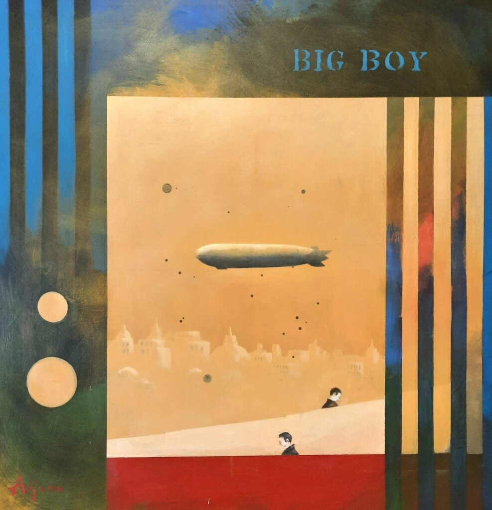 Det är ofta olika element som är avskurna och isolerade från varandra. I denna tavlan «Big boy» ser vi ett stort luftskepp som passerar över en stad. Luftskeppet är på en och samma gång fridfullt, fascinerande och hotfullt. Det ger associationer till något militärt; som tex en torped, en missil eller en bomb. De två personerna är på väg någonstans, var till sitt. De är slutna om sig själva och är tydligen inte medvetna om eller intresserade av luftskeppet.