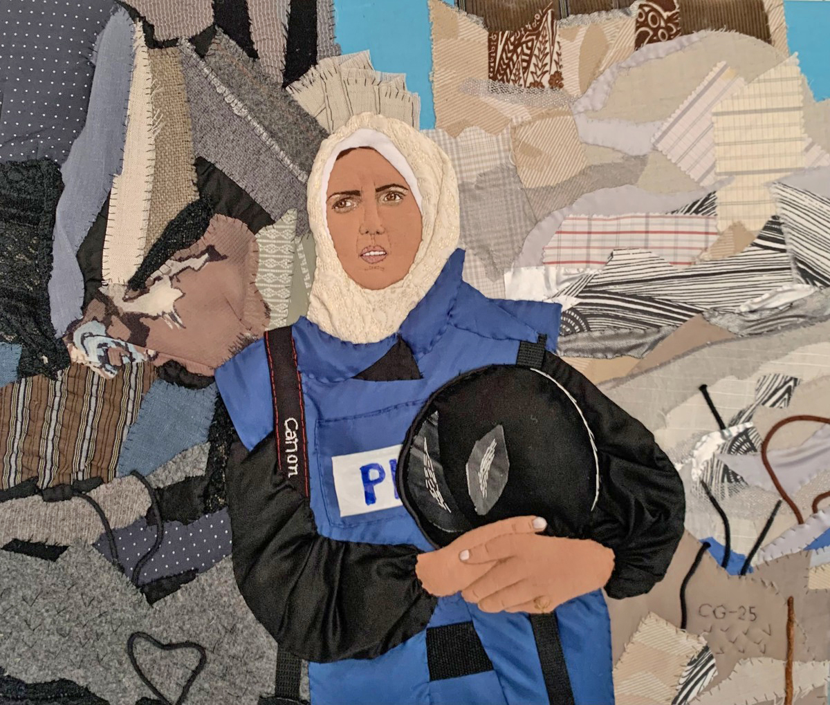 Tygapplikation med broderi, sydd för hand 2025, 58 x 48 cm. Fritt efter foto av Jehad Alshrafi, Gaza, med hans tillstånd.