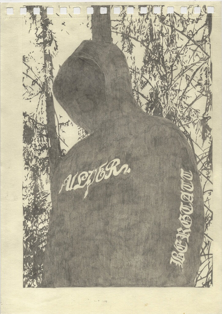 Många av mina motiv hämtar jag från olika subkulturer, såsom datorspel, black metal, och dungeon synth. Jag intresserar mig för subkulturen som både konstnärligt och politiskt uttryckssätt. De bilder jag tecknar föreställer ofta människor från dessa kretsar, ofta fast rotade på internet. Tecknandet blir en form av omsorg, där jag genom tid, uppmärksamhet och närvaro kan ge plats åt något som ofta annars kan framstå som löjligt, ironiskt eller pretentiöst.