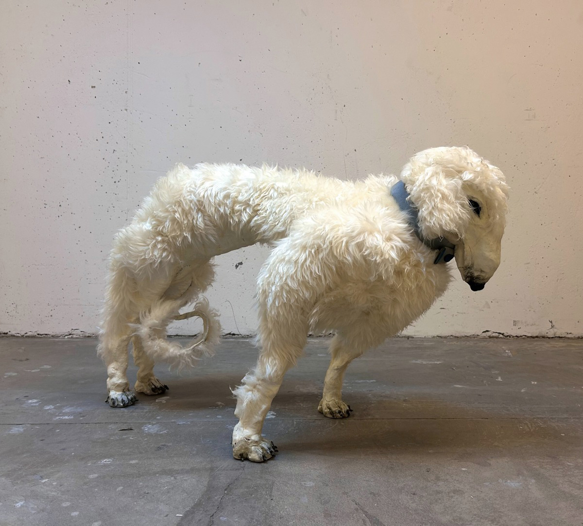 Verket är just det, en hund och inget mer. Jag fick min inspiration av att jag just ville ha en hund. Den viljan var absolut, men som ung student finns varken tid, utrymme eller ekonomi för att faktiskt kunna ta hand om en. Men med lite ståltråd, papier-maché och hemmagjort klister, fanns plötsligt en hund i mitt liv. Pälsen är från en gammal fårfäll jag hittade på en loppis i somras och halsbandet är ett äldre skärp, ditsatt hänglås med saknad nyckel till.