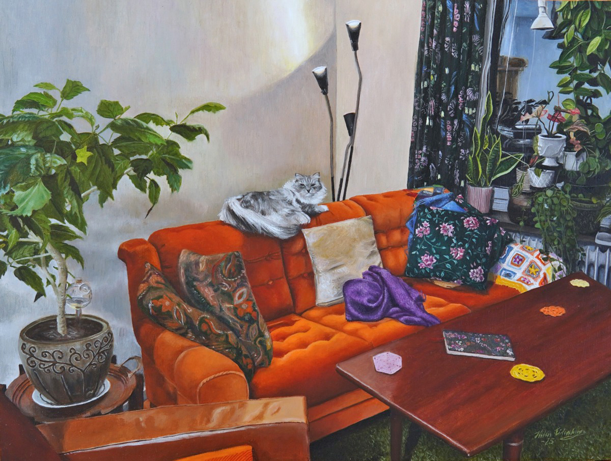 ”Orange soffa” är en ögonblicksbild från mitt vardagsrum som det såg ut just då. Jag inspireras av det jag har omkring mig i vardagen, som bara finns där varje dag och kanske tas för givet. Det kan vara en känsla, en färgskala eller något jag ibland inte kan sätta fingret på. Jag överrumplas ofta av hur vackert det är i omgivningen, i alla små detaljer och skiftningar. Trots att jag många gånger tycker att världen är ganska hård och kall så finns det så mycket vackert överallt om man bara tittar.