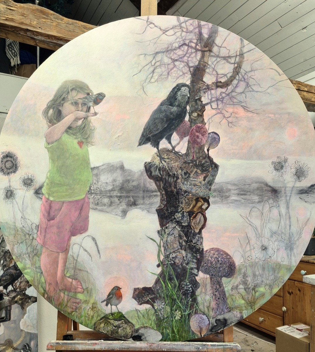 Flickan leker med fågeln som har landat på hennes hand. Den lilla rödhaken som sitter i vattenbrynet på en sten är en symbol för min kristna tro. Landskapet bakom påminner mycket om min bild av Lappland, där jag har vistats några gånger. I Lappland trivs jag med tystnaden, lugnet och friheten. Där känner jag mig liten och omsluten av den mäktiga naturen.