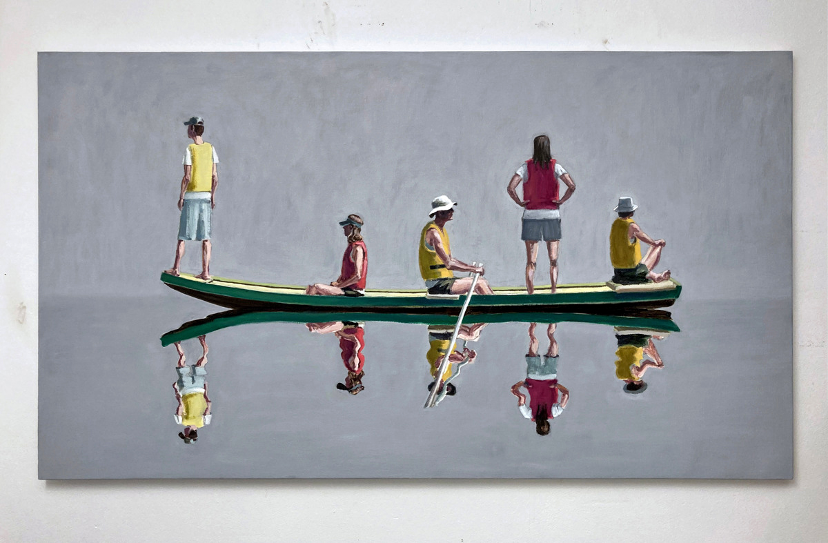 År 1900 målade Carl Larsson Vikingatåg i Dalom, en akvarell föreställande hans barn på utflykt i en eka. Det blev en av hans mest populära målningar och den skulle komma att hänga som affisch i många svenska klassrum. I min målning Åter till Dalarna har jag behållit Carl Larssons eka, men ersatt barnen med nutida människor.
