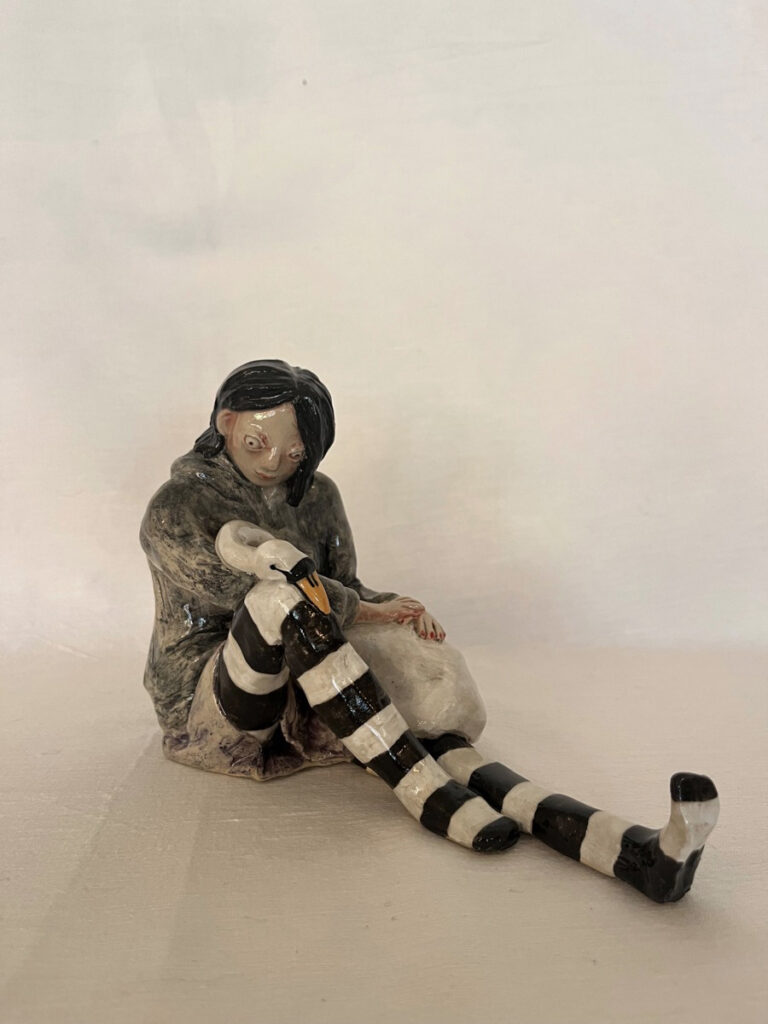 Jag har bett min sambo ta bilder på mig hemma i vardagsrummet och sen tagit med dem till ateljén. Där har jag härmat noggrant men också tagit mig stora friheter. Där har figurerna förändrats tills de inte längre är särskilt lika mig. Där har jag också fantiserat om djuren.