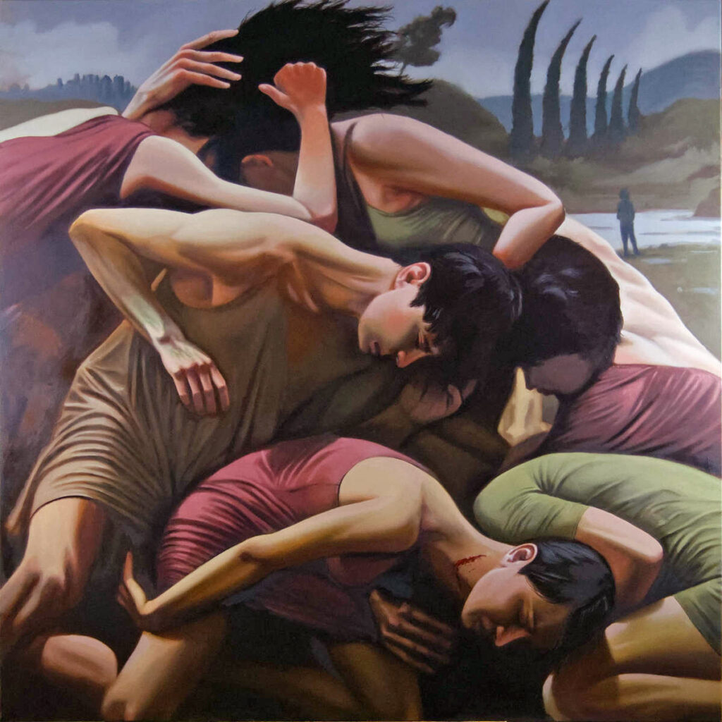 Detta storskaliga verk (140×140 cm) är en utforskning av “det sociala spelet” – det där outtalade, labyrintiska regelverket som styr mänsklig interaktion. Kompositionen presenterar en massa av kroppar som kollapsar in i varandra och bildar en tung, organisk arkitektur. De är sammantrasslade på ett sätt som känns oskiljaktigt förbundet men ändå djupt isolerat. Här är minglandet avskalat från sin cocktailparty-fernissa och avslöjat som en rå, fysisk tyngd.