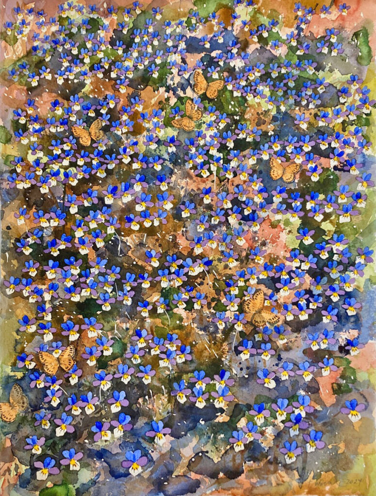 Jag har gjort flera målningar med violer, med eller utan fjärilar. Jag får ofta frågan om det inte är pilligt och tålamodsprövande att greja med så många violer. Men det är rätt kontemplativt och en fin kontrast till det mer impulsiva målandet av bakgrunden.