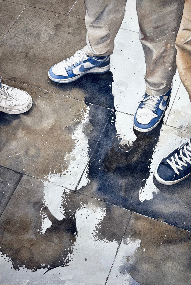 Jag är en autodidakt akvarellkonstnär från Stockholm. Mitt verk är en ögonblicksbild från en blöt gata i Barcelona.