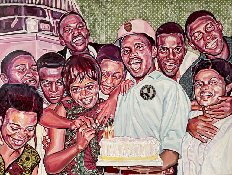 Esiri Erheriene-Essi, The Birthday Party 2021 Oil, ink and Xerox transfer on linen 150 x 200 cm Courtesy of Jorge M. Pérez Collection, Miami, and Galerie Ron Mandos © Image Copyright Esiri Erheriene-Essi When We See Us: ett sekel av svart figurativt måleri.jpeg