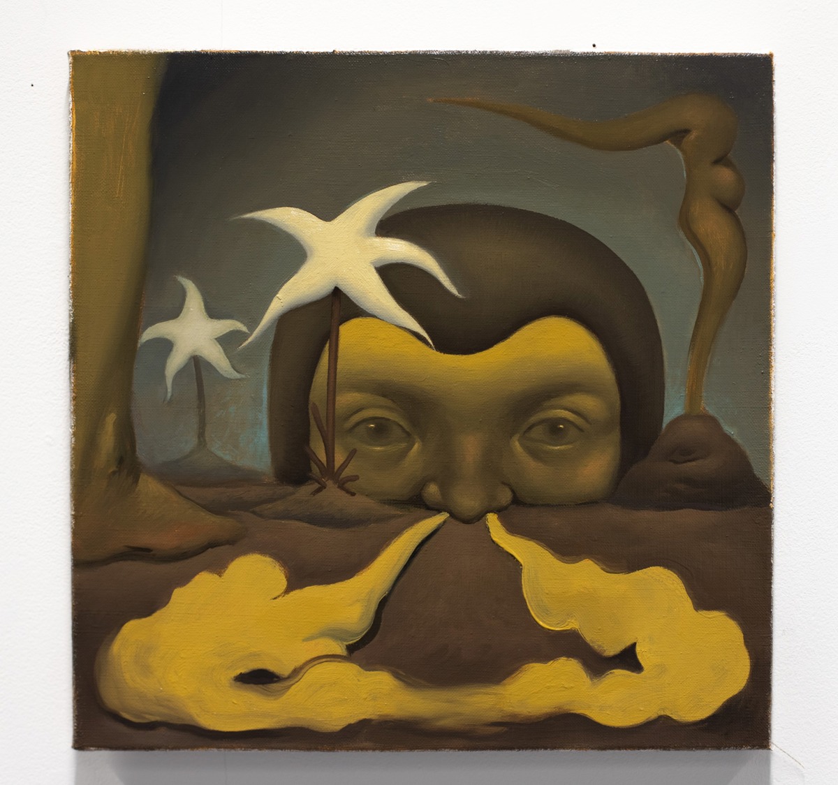 Under processens gång skiftar jag mellan intuitiva processer och en kritisk närvaro, försöker komma underfund med det diffusa universum som uppenbarar sig på canvasduken. Sällan vet jag exakt vad det är för typ av historia jag vill berätta från början, narrativet växer fram genom en sorts associationslek där verkets första invånare sätter tonen.