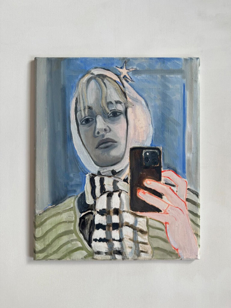 Självporträttet ser jag som en slags dagboksinlägg, eller bekännelse. Just detta kom till i en tid av mellanrum, ovisshet, sökande efter kärlek. Mobilen finns där som en behållare för längtan och främmandegörande. En portal som förbinder jaget till sin omvärld, samtidigt som att portalen lämnar jaget ensam.