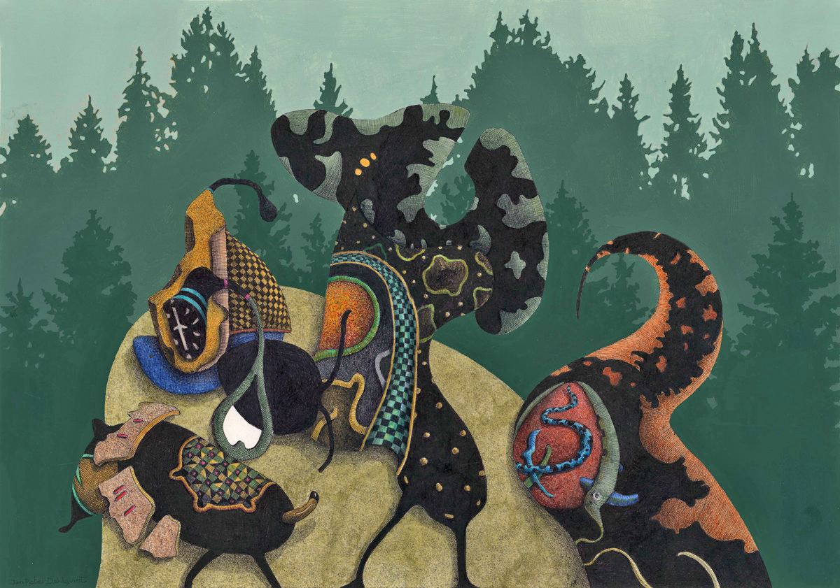 Siluetten av granskogen i bakgrunden kom till sist och placerar mina påhittade organiska figurer i en slags ”verklighet” vilket skapar ett intressant möte.