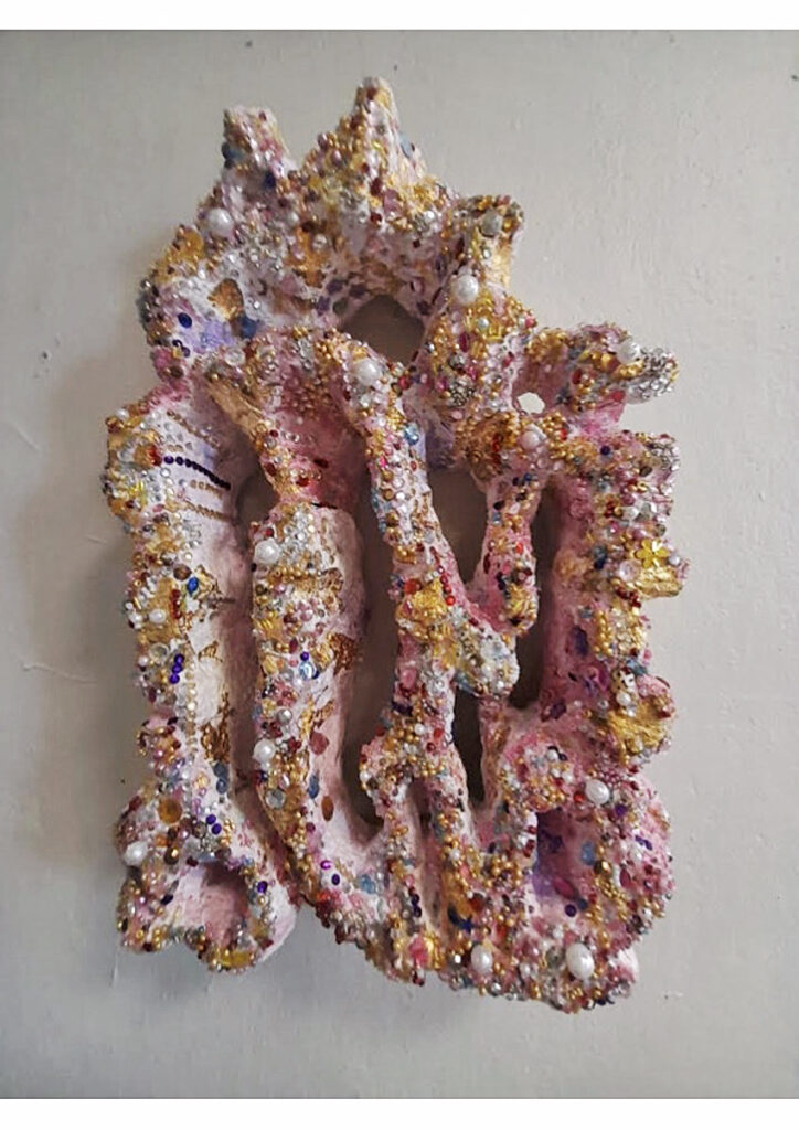 I paint, sculpt and make public art. In my art I often express emotions such as longing, being in love or suffering. In the ”Bejeweled Pink Coral ” my intention was to express the mystery of the secret world of the sea, it’s calm and magic. I love the colors of coral and their beautiful shapes, and I wanted to express the feelings I had for coral in my art. ”The Bejeweled Pink Coral” is the most recent piece I have created in a series I have been working on for five years, with the theme of seaforms and coral. I began creating these artworks for my ”Seaforms and the Sacred” exhibit at the Passagen Art Hall in Linköping, southern Sweden, in 2023.
