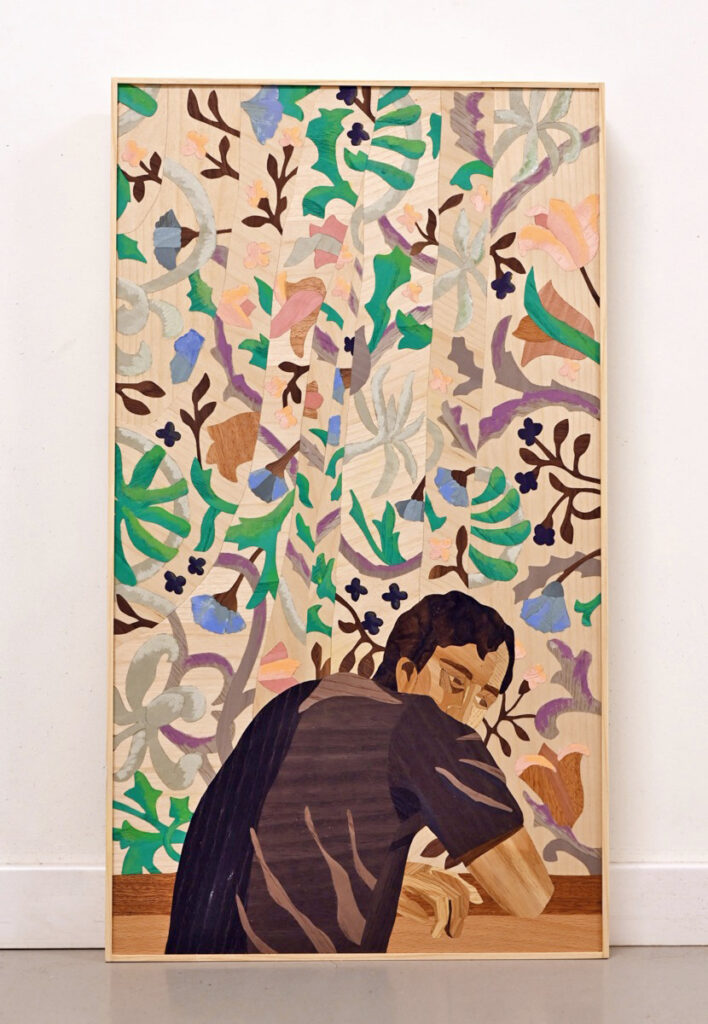 Mitt verk i årets vårsalong sticker ut bland mina tidigare verk då jag testat något som är nytt för mig. Efter att själva intarsian var färdigställd har jag gått över den och målat med akrylfärg ovanpå intarsian. Det här var ett nytt sätt för mig att arbeta och något jag vill fortsätta utveckla framöver.