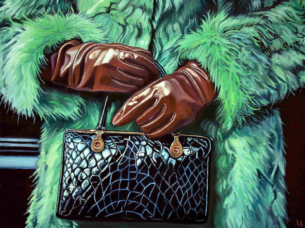 Jag älskar att gestalta material i mitt måleri. För det mesta blir det glansiga jackor, boots och handskar. För mig symboliserar det glansiga materialet det ytliga och polerade som vi visar upp mot varandra. I vardagen eller på sociala medier. I den här målningen testar jag mig fram och låter det glansiga materialet få möta den håriga fuskpälsens material. Jag är inspirerad av modevärldens estetik och jobbar ofta med inzoomningar eller iscensättningar i mina verk.