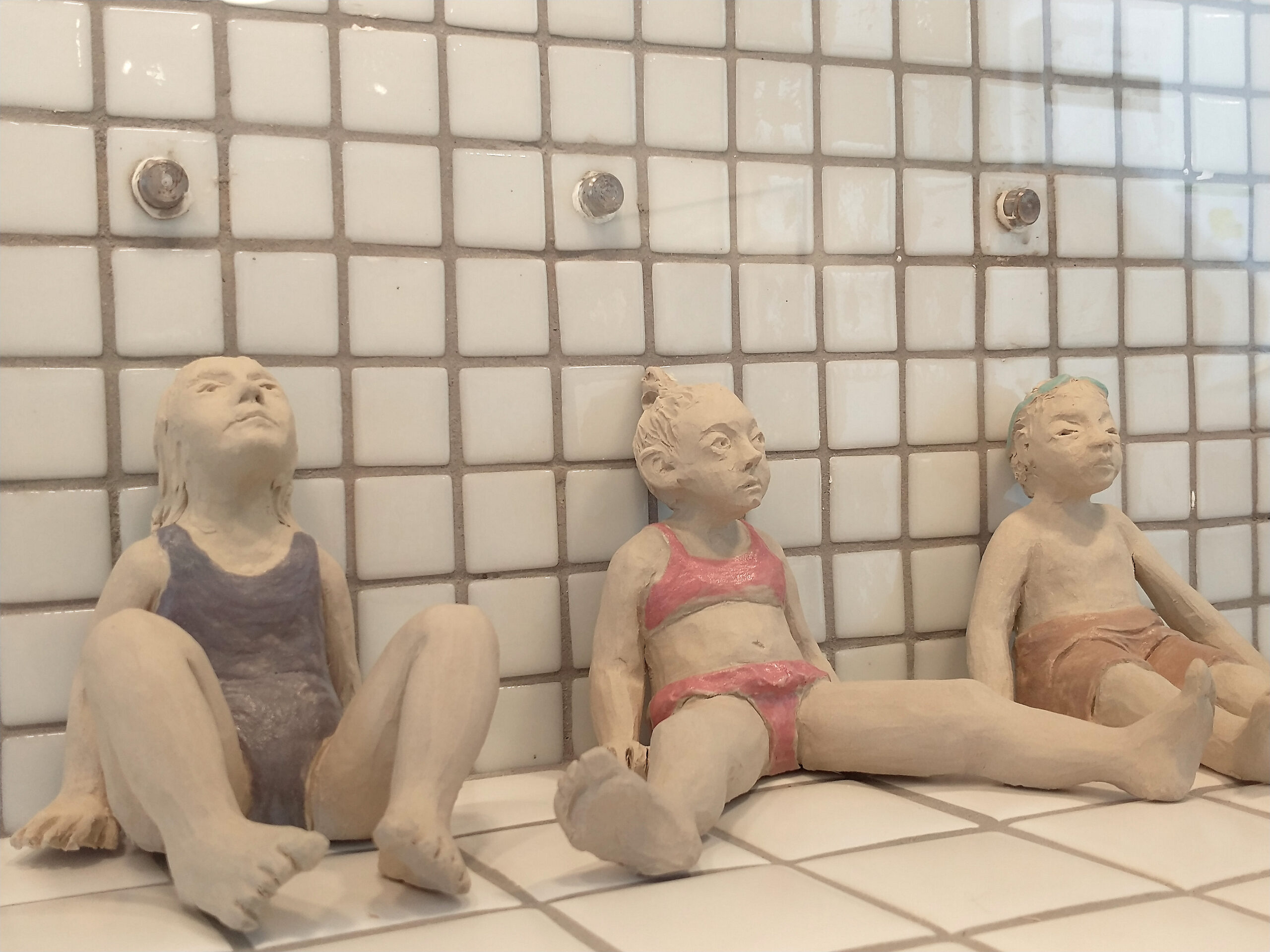 Motiven hämtas från politiken, aktualiteter och ut min egen minnesbank – vardagshändelser vänds till surrealism och absurditet. Verket Simhallen är baserat på ett självupplevt minne från barndomen där vi simskolebarn fick öva på simtag i herrarnas omklädningsrum.