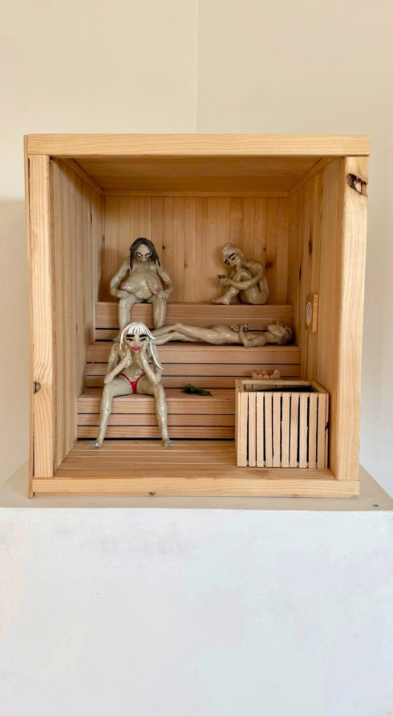 I mitt verk ”Tankar för dagen” vill jag skapa en lågmäld men intensiv närvaro där jag bygger ett eget universum som speglar bastuns tillstånd – avskalat, koncentrerat och öppet. Här vill jag ge betraktaren utrymme att projicera sina egna erfarenheter och känslor, och att röra sig mellan igenkänning och främlingskap.
