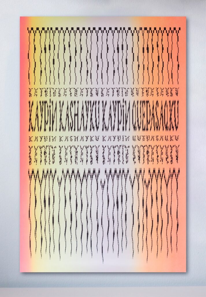 Som en del av arbetet med poster-serien har jag utvecklat ett variabelt pixeltypsnitt, inspirerat både av Guaman Pomas bokstavsformer och av quipus – ett andinskt kommunikationssystem baserat på knutar. I detta verk upprepas budskapet ”Vi är här, och här kommer vi att stanna” i olika stadier av förvandling, från quipus till bokstäver.