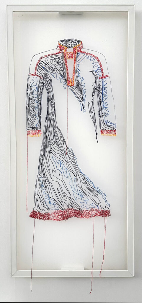 Jag arbetar med spänningen mellan broderiet, dess skugga och det rum som uppstår däremellan. För mig speglar detta en identitet som funnits närvarande, men aldrig helt uttalad.
