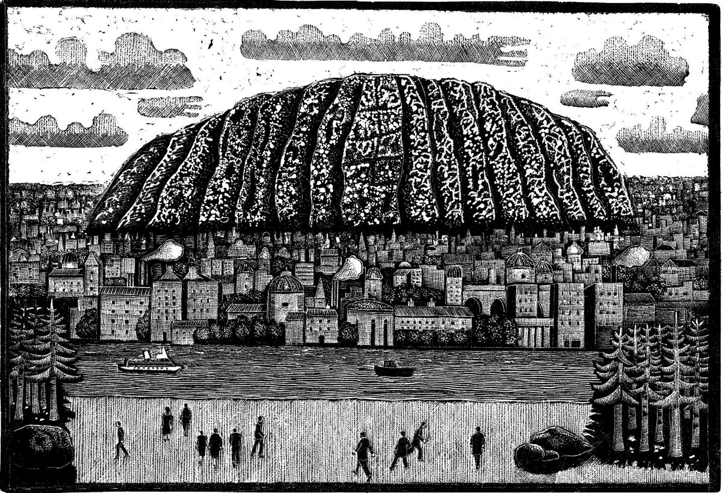 Ett av de grafiska bladen som jag fick antagen till Vårsalongen i år ,”På stranden”, kom till efter att jag hade läst en artikel om Ayers Rock, en 500 miljoner år gammal sandstensmonolit i öknen i Australiens Northern Territory. Ayers Rock har en stor religiös betydelse för urbefolkningen och var tidigare en stor turistattraktion, men är det inte längre. Turisterna har stoppats från att besöka berget då de helt enkelt skräpade ner det.